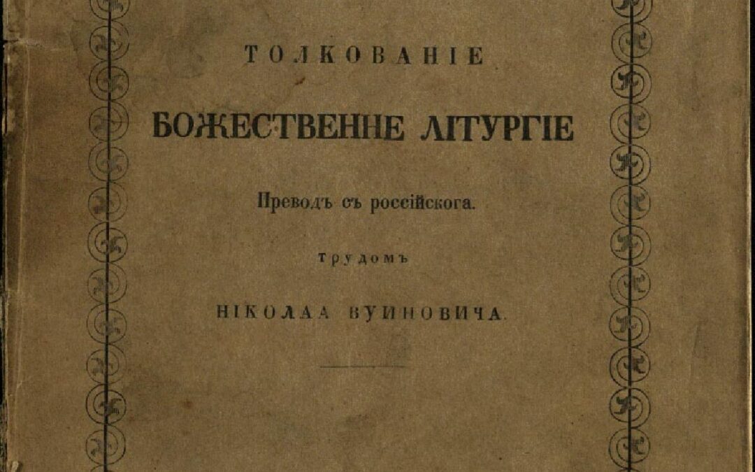ТОЛКОВАНІЕ божественне літургіе : раздѣлено на седамь проповѣдій узъ светый великій постъ / Преводъ съ россійскога трудомъ Ніколаа Вуиновича.... - У Будиму : Писмены крал. Свеучилишта Пештанскогъ, 1846. - 94 стр. ; 22 cm. Новаковић 1404; Кириловић 1199; КНБС 2693; Панковић 1294; Српске штампане књиге БМС 1801-1867, 4699. - Предговоръ / Ніколай Вуиновичь: стр. VII-X. - Списак пренумераната.