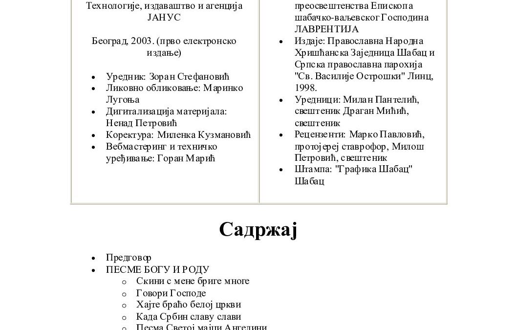 Збирка песама духовног и родољубивог садржаја, које одражавају православну веру и српску традицију.