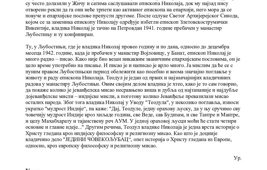 Кључне речи: Владика Николај Велимировић, Теодул, јеванђелска мисао, индијска философија, манастир Љубостиња