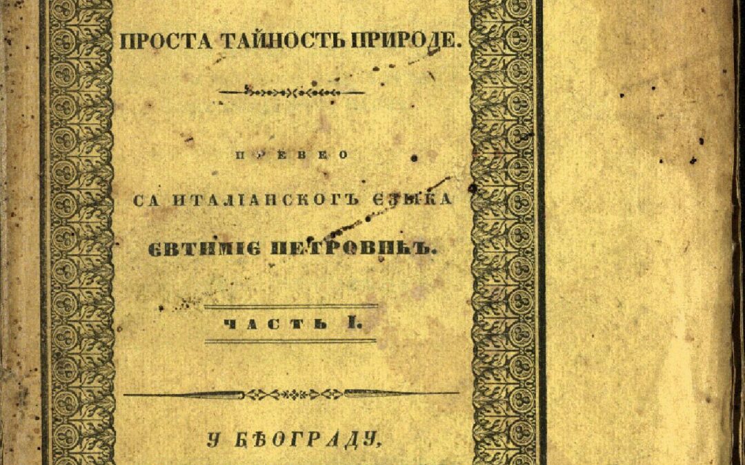 ВОЋНЯКЪ или проста тайность природе открывена у време єстива свѣжегъ воћа, млоги воћія, коя се по Европи, восточной и западньой Индіи и прочим Азіє, Африке и Америке предѣлима наоде. Часть 1 / покупіо с италіанскогъ и на србскій єзыкъ превео и издао Євтиміє Петровићь. - У Бѣограду : печатано у КньигопечатнЬи Княжества србскогъ, 1840. - XXXIV, [2], 118, [6] стр. ; 22 cm Новаковић 1140; Кириловић 925; КНБС 1977; Панковић 1020; Српске штампане књиге БМС 1801-1867, 660. - ПредговорЪ / ПреводителЬ: стр. III-XXIX. - Изясненіє рѣчій на србскомъ и италіянскомъ єзыку: стр. 106-118. - Списак пренумераната.