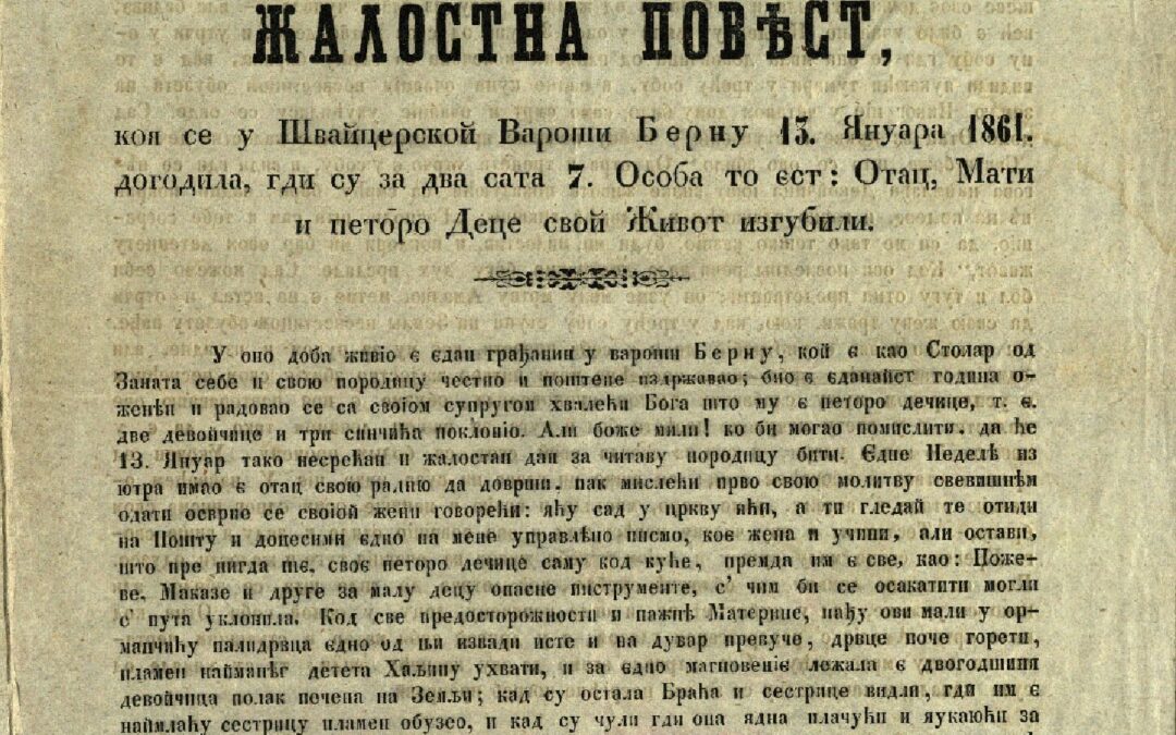 ЖАЛОСТНА повѣст, коя се у Швайцерской Вароши Берну 13. Януара 1861. догодила, гди су за два сата 7. Особа то єст Отац, Мати и петоро Деце свой Живот изгубили. - У Панчеву : Књигопечатња А. Сибенхара, [1861]. - [4] стр. ; 26 cm. Кириловић 2060; Српске штампане књиге БМС 1801-1867, 1164. - Садржи и: Песма.